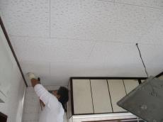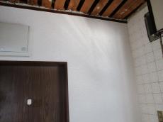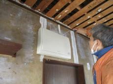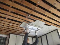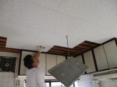 | まずはキッチンの天井から施工をしていきます。 既存のパネルを取り外し、照明を一度取り外した様子です。 |