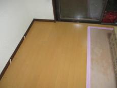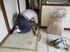 | もう一息で、キッチン床のフローリング施工も完了します。 | この後収納の扉を取り付け、作業が完了しました。 | 今回のリフォームでは、洋間にもフローリングを張っていきます。 まずは既存のカーペットを剥がしていきます。 |