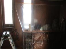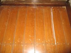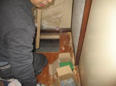 | くさびを使って張ったフローリングを床にしっかりと定着させていきます。 | 次に廊下のフローリング張替え作業に入っていきます。 | お家が汚れないように、養生も怠りません。 |