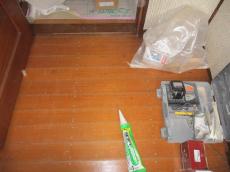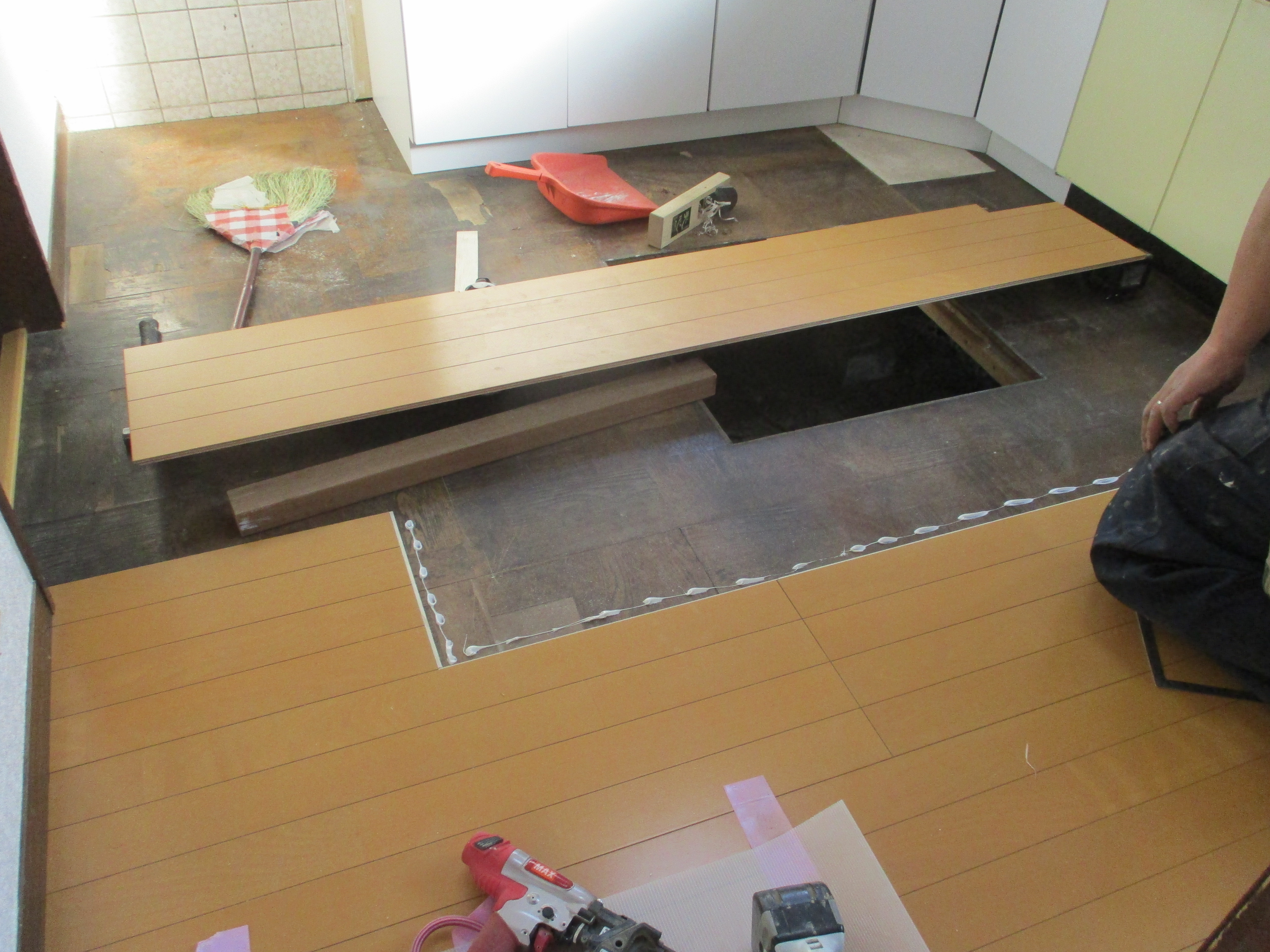 | 今回キッチンの床に張るものは、明るい色味の真新しい綺麗なフローリングです。 | 床下に入りながらキッチン床の施工をしていきます。 | 既存の床にフローリングを張っていくので、床面が少し高くなってしまいます。 |