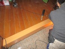 | 玄関の上がり框部分に使う床面を切り出していきます。 | 職人が手作業で、ぴったり合うサイズのものを作り出していきます。 | 切り出した部分を使って、上がり框部分に張りつけていきます。 |