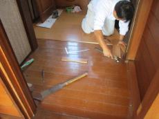 | 廊下の床下も腐っていて床鳴りがしていたので、補強作業をしていきます。 | 補強の為に木材を取り付けていきます。 | 穴を埋めるために、フローリングの一部を加工していきます。 |