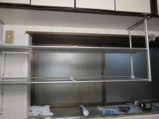 | 水切り棚の撤去が完了しました。 | ここから新しい水切り棚を取り付けていきます。 | 水切り棚の設置が完了しました。 ピカピカに光り、強度もバッチリです。 |