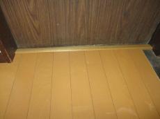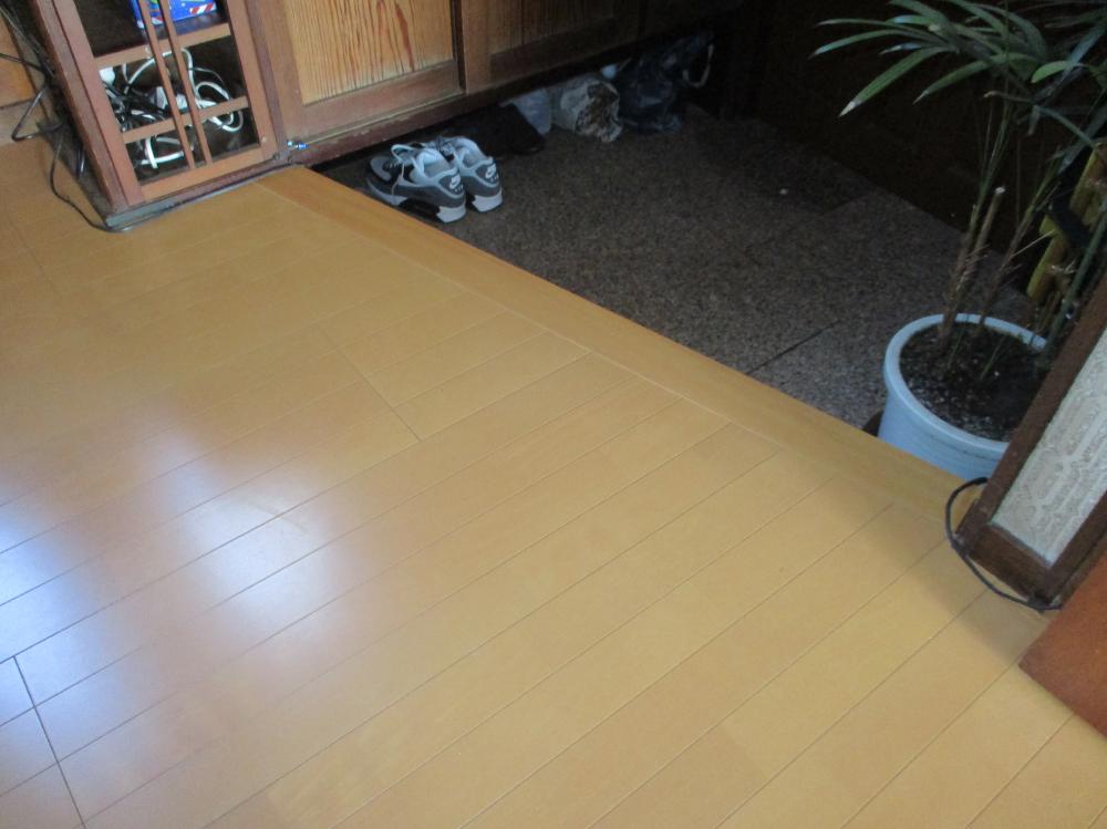| 洋間を覆うカーペットは汚れが目立ち、古ぼけた印象を受けます。 | こちらは玄関部分のフローリングです。 | 別角度のお写真です。 |