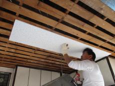 | 最後の一枚を張り終えて…。 | 寸分のずれもない綺麗な天井が完成しました。 | 最後に照明を取り付けて、天井の施工が完了しました。 |
