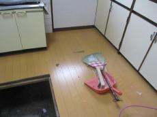 | キッチンの撤去をしていきます。 | 徐々にキッチンが運び出されていきます。 床には長年の汚れが溜まっていました。 |