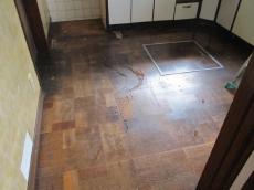 キッチンの床も汚れが目立ち、全体を暗く見せてしまっています。 | 今回キッチンの床は新しくフローリングの張り替えを行います。 |