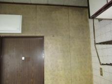 キッチンのプリント合板はすっかり汚れきっています。 | キッチンという場所柄、油汚れなども激しい部分なので、クロスを張っていきます。 |