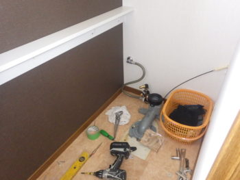 今回のトイレリフォームでは壁面へカウンターをつけるため、ベニヤ板にて壁面下地を補強いたします。