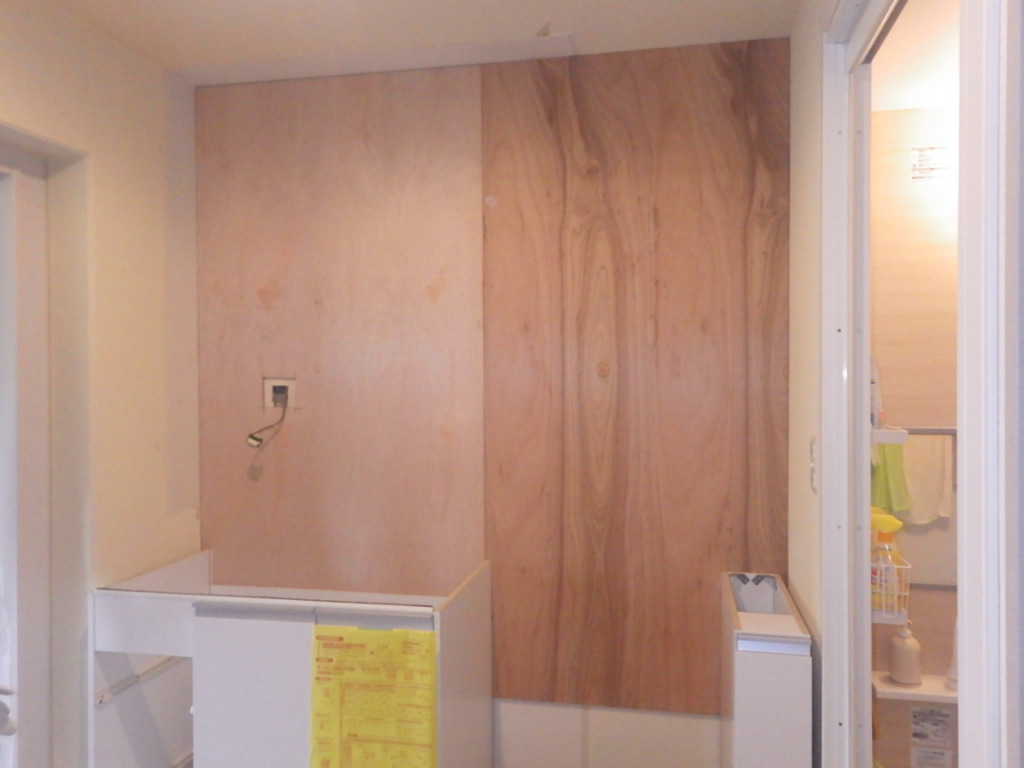 撤去後には壁面をべニアで補強し、大きな鏡を取り付けても問題ない下地に作り替えていきます。