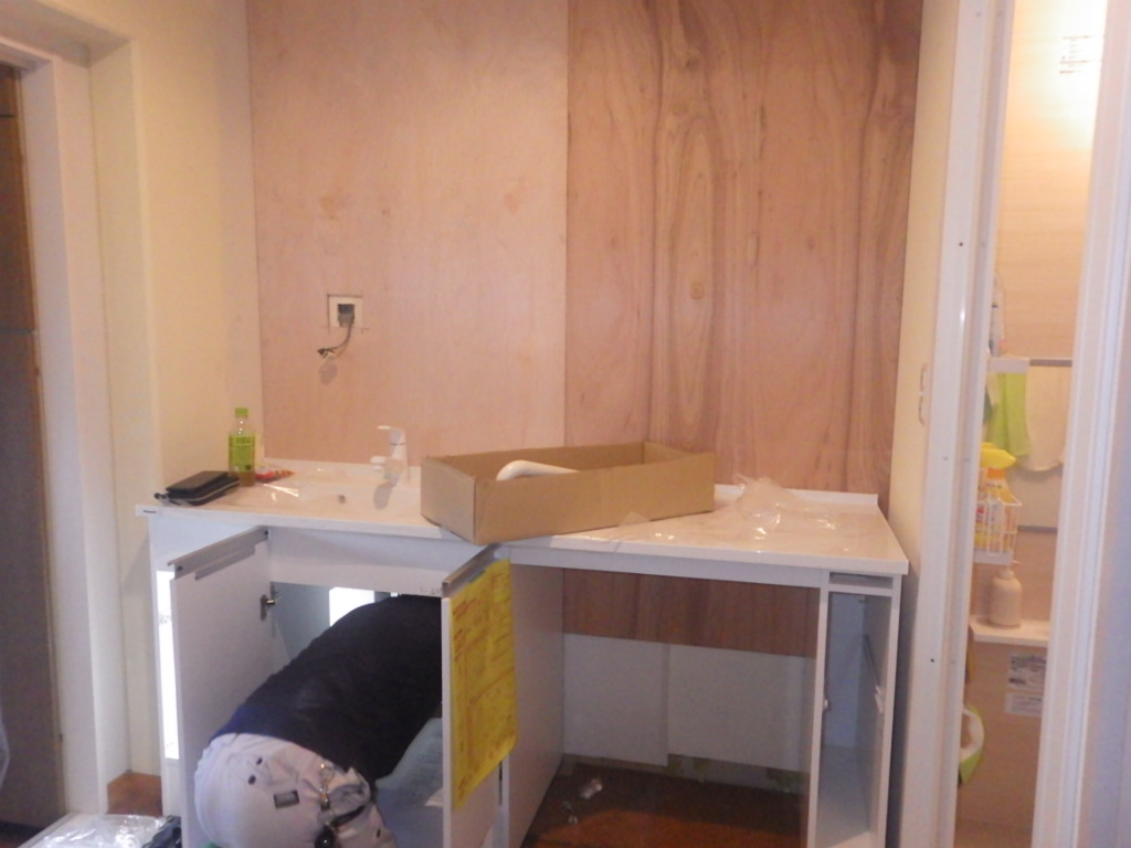 下地補強後に洗面化粧台の取り付けを行っていきます。