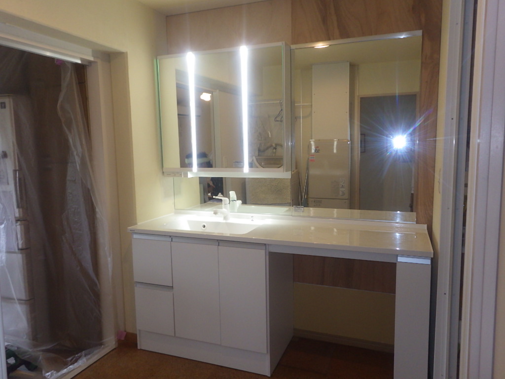 大きな鏡と明るい照明で使い勝手の良い、パナソニックシーラインの取り付けが進んでいきます。