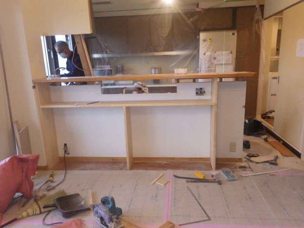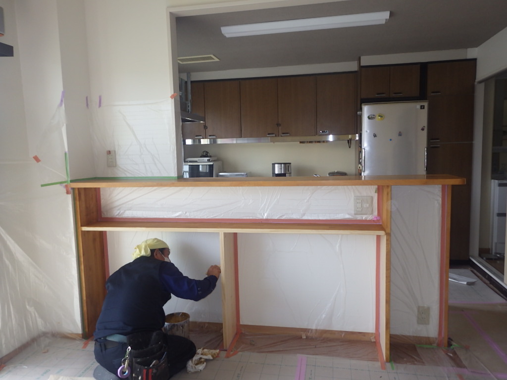 壁面にクロスを貼り、カウンター下収納の造作作業もいよいよ大詰めです。