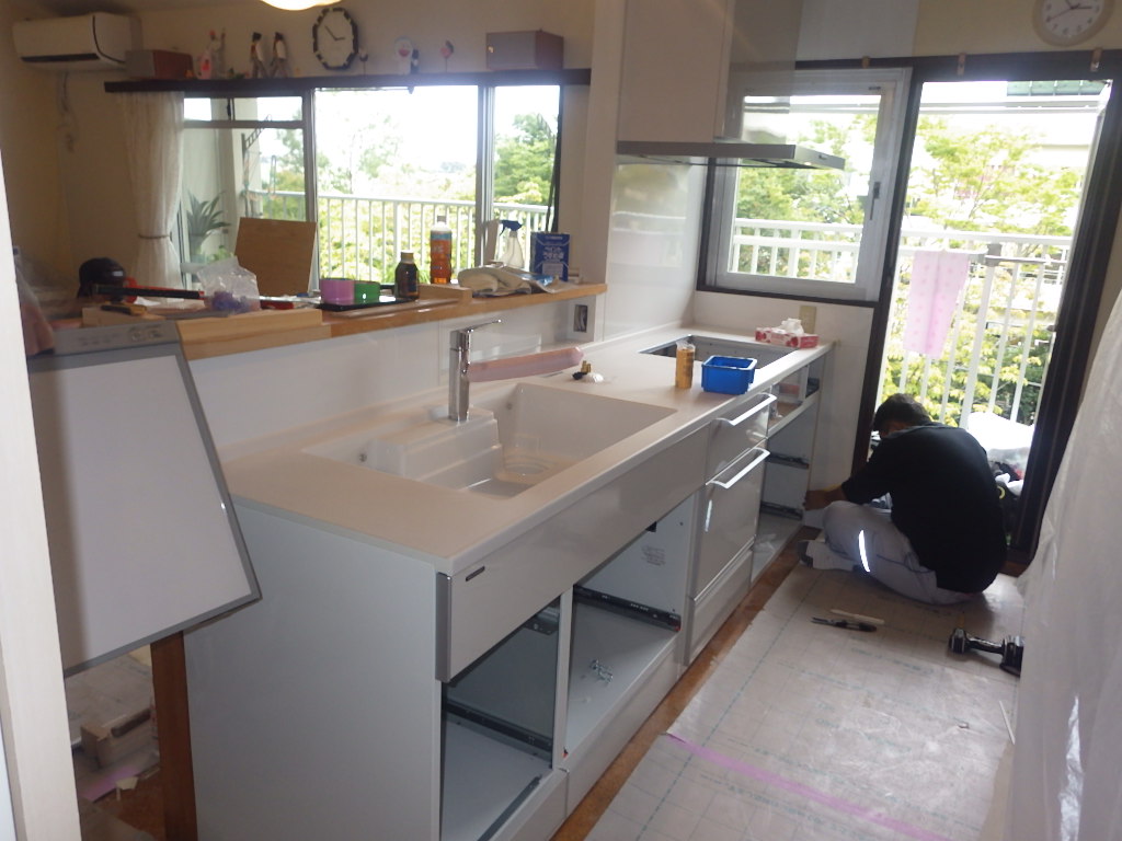 キッチン側では新しいシステムキッチンが運び入れられ組み立てが進んでいきます。