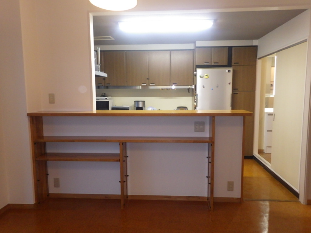 M様はHPからお問い合わせいただき、同じマンションでオープンキッチンにした事例をご覧いただけていたとのことでした。 その事例と同様に、カウンターキッチンを開放的にお使いいただけるように吊戸棚は撤去し、圧迫感がないキッチンへのリフォームをご提案いたしました。 キッチンの作業側ではカウンターを上げる施工を行い、 ニッチを作って調味料などを収納できる箇所を作っております。 |