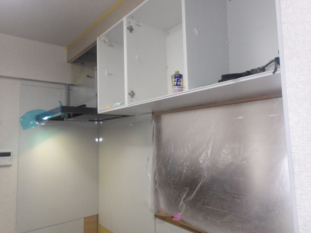 撤去作業後にはキッチンパネルを貼り、吊り戸棚を新しく取り付けていきます。