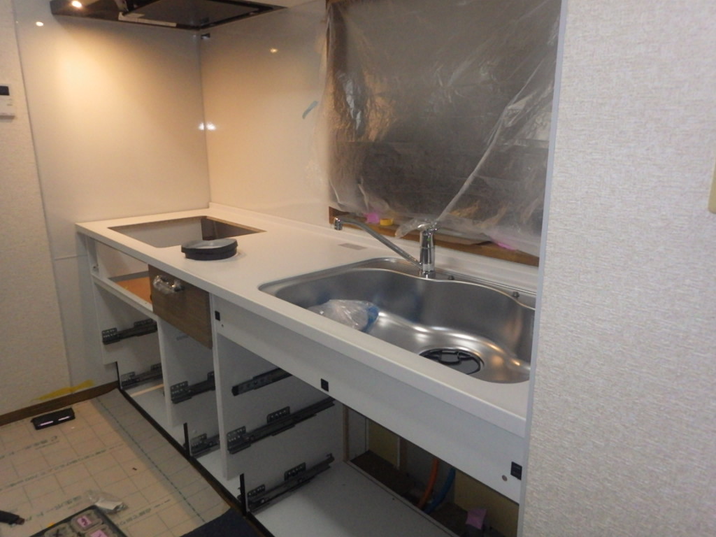 ここからはいよいよシステムキッチンを運び入れ組み立てを行なっていきます。