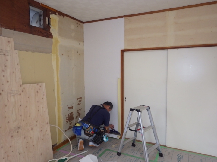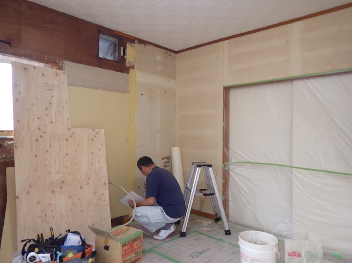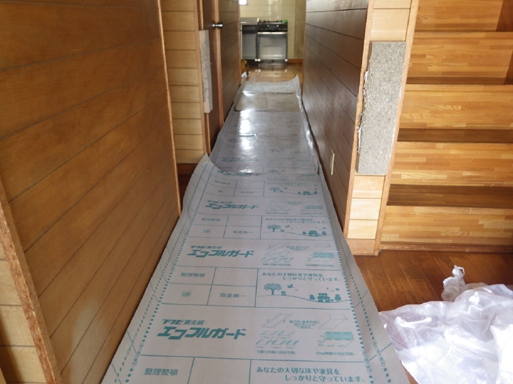| 施工に入る前に、お家の中を丁寧に養生していきます。 | キッチンの解体を行っていきます。 まずは吊戸棚から撤去をしていきます。 |