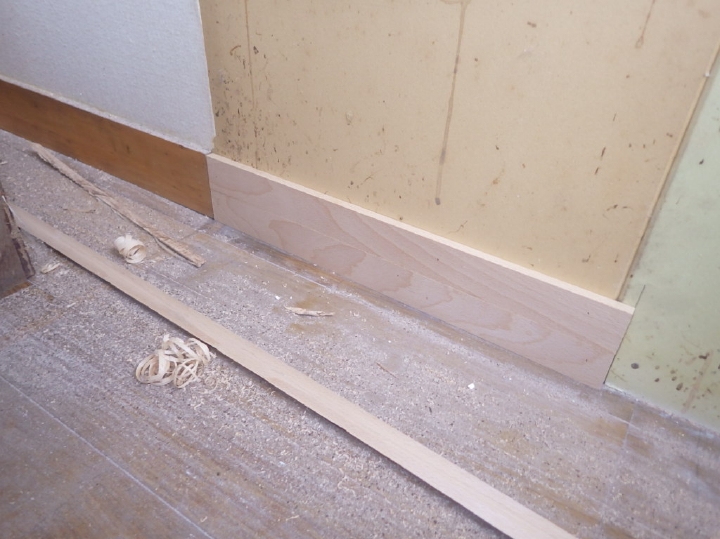 壁に面している巾木は長さが足りていませんでしたので、板を加工し取り付けています。 |