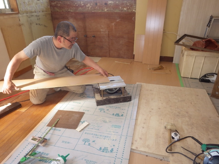 | キッチンの天井は油による染みがありましたので、今回は塗装にてリフォームを行います。 | 職人によりフローリング材の加工が進んでいきます。 |