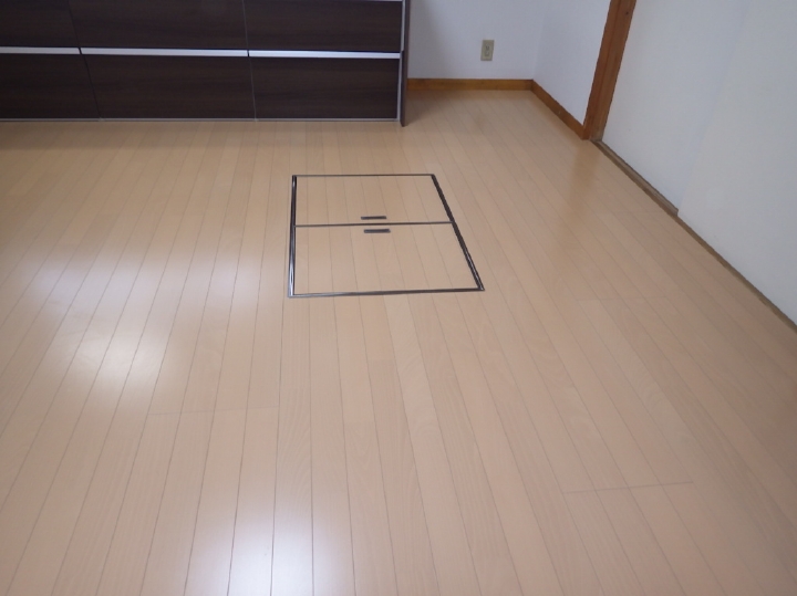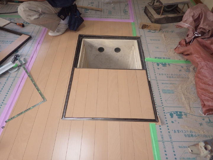 先ほどの床材を用い、キッチン床を重ね張りにて施工していきます。 床下収納も目地を揃えて綺麗に張り直されました。 |