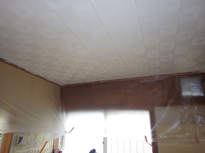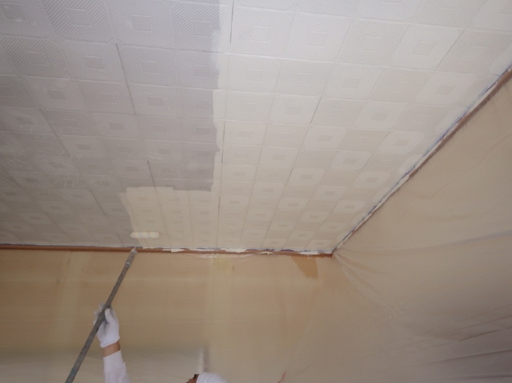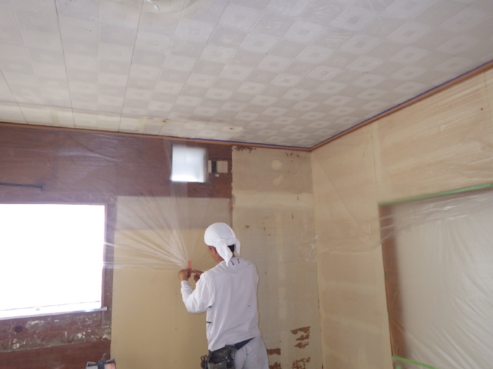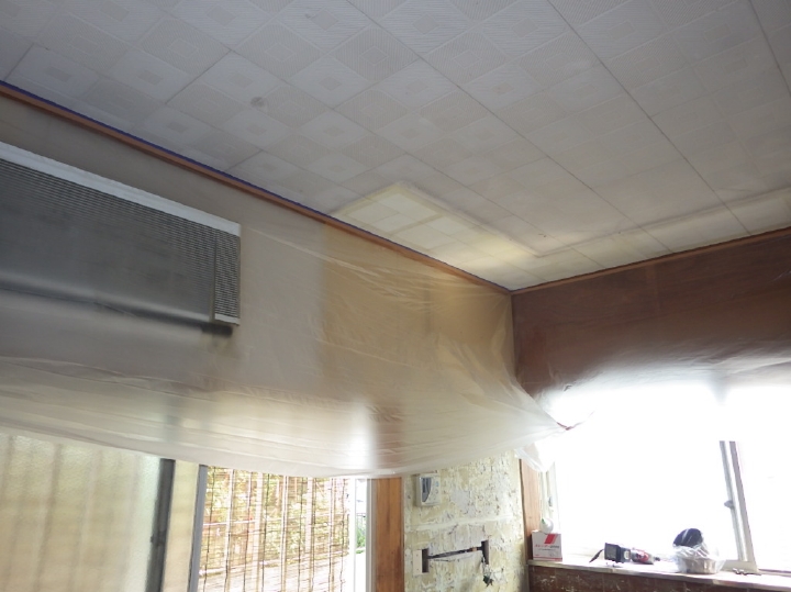 | これより天井の塗装に移っていきます。 まずは壁面を汚さないようにビニール養生を丁寧に行います。 |
