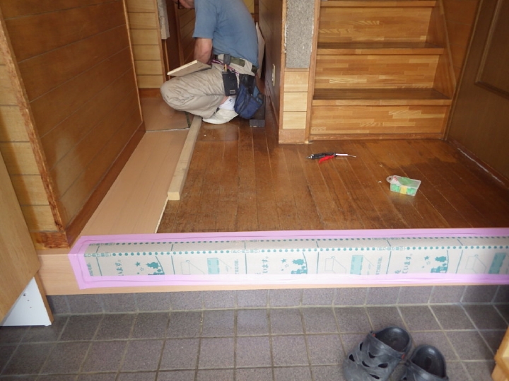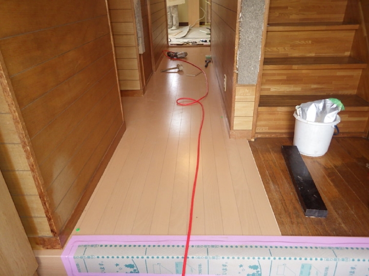 | シルバーステンレスの作業台は広く、お料理をするのが楽しくなるような素敵なキッチンです。 | 今回は玄関廊下も張り直しにてリフォームいたします。 | 経年により沈みの有った廊下も、下地補強ののちに12mmのフローリング材で重ね張りを行っていきます。 |