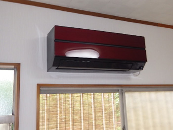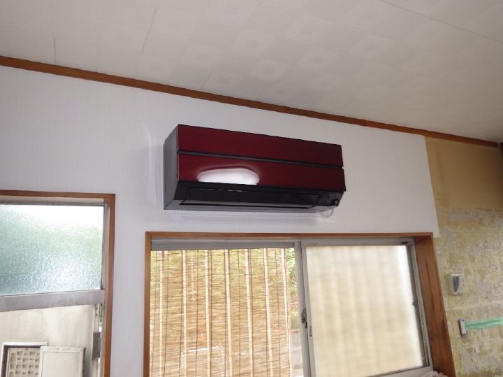 | 見違えるように綺麗な壁に生まれ変わりました。空間には上品な清潔感も感じられますね。 | 新しいエアコンは高級感あふれるワインレッド調の物へと交換しております。 | 室外機もエアコンと合わせて新しく交換していきます。 |