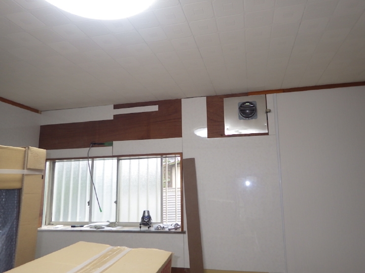 | 室外機の交換後のお写真です。 | いよいよキッチン本体とキッチンパネルの施工に入っていきます。 | キッチンパネルはクロスと統一感のある、真っ白で清潔感のあるパネルを使い張っていきます。 |