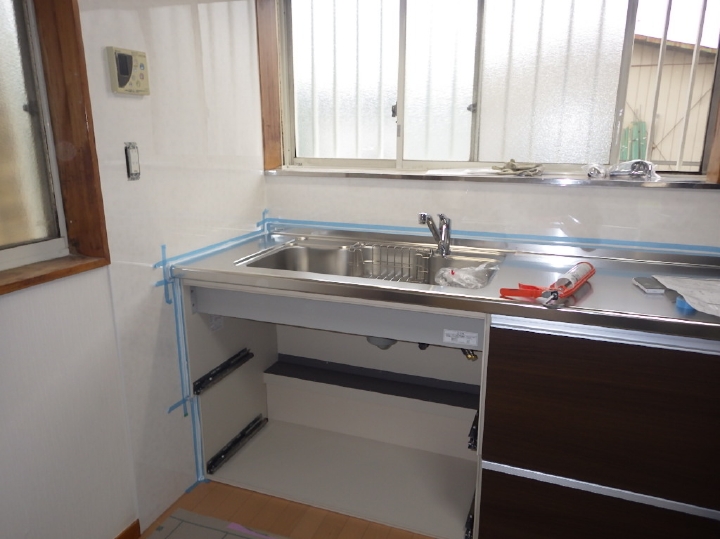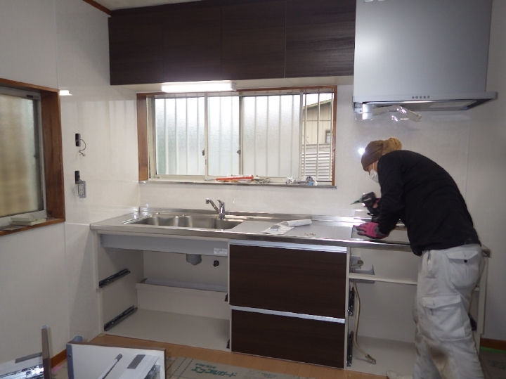 キッチンの組み立てが着々と進んでいきます。今回のキッチンはクリナップのラクエラをご用意いたしました。 |