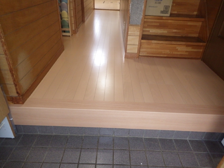 | 以前は経年による傷みで沈みが見られたキッチン床も、高級感のある綺麗なフローリングで張り直しリフォームが完了しました。 | 同じ素材を使い、玄関も張り直しにてリフォーム完了です。 傷みがあった上がり框もツルツルの足ざわりで気持ちがよさそうですね。 |