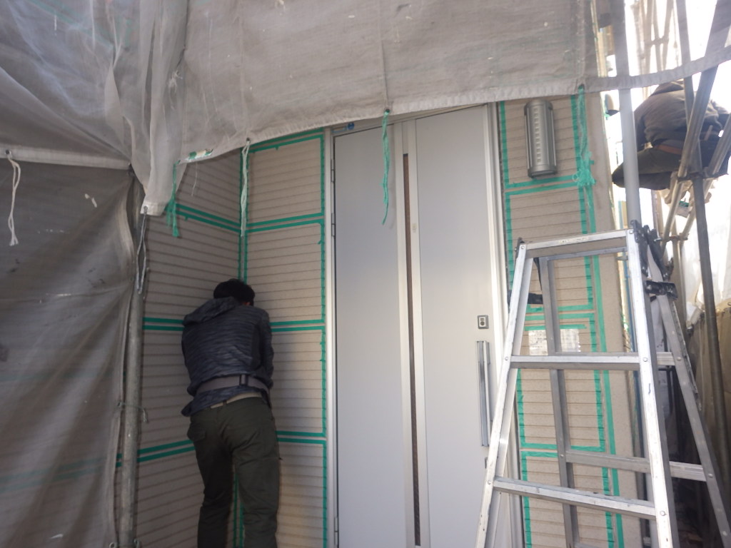 雨漏りで劣化している玄関ドア壁の補修も行っていきます。