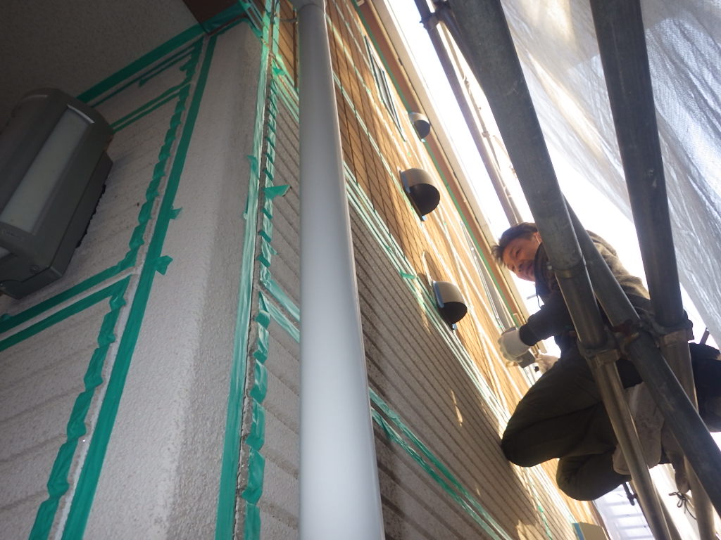 足場を仮設し、養生シートをかけたのち施工に移っていきます。
