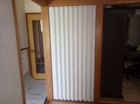 | 和室の畳は築30年ほどということもあり、色褪せが目立っておりましたので、今回は一畳から半畳タイプへの畳張りの和室へと作り変えます。 | 襖はこちらのみアコーディオンタイプの仕切りへ交換いたしました。 |